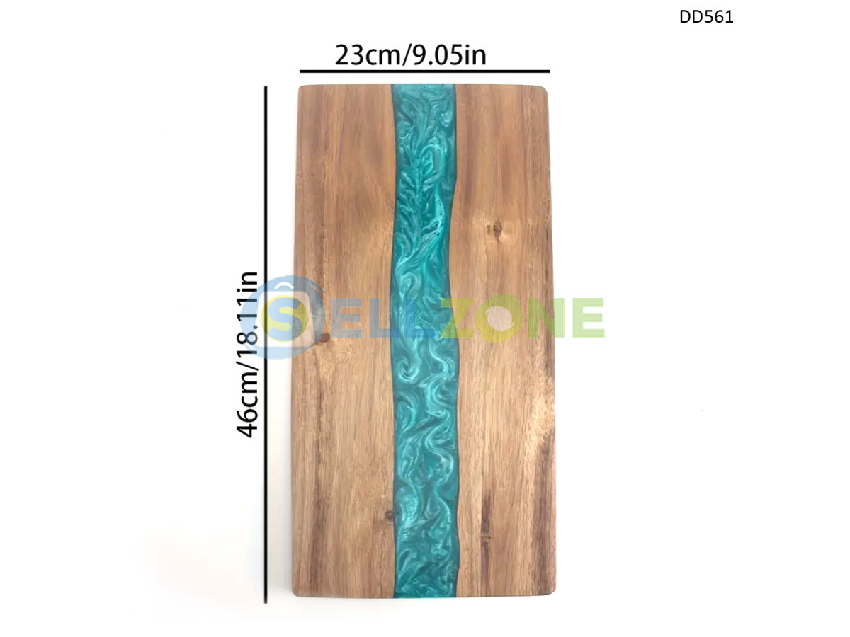 Продълговата дъска DD561 съчетава естетиката на природните материали с изкуството на ръчната изработка. Вдъхновена от течението на река, тюркоазената епоксидна смола преминава през средата на дъската, създавайки ефект на дълбочина и движение. Тази дъска не само ще ви служи в кухнята, но и ще внесе усещане за стил и изящество във всеки дом